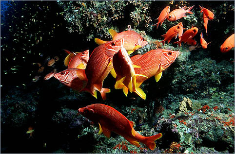 Small shoals of Long-jawed Squirrelfish (Sargocentron spiniferum) and Red Soldierfish (Myripristis murdjan) hover in crevices during the day and disperse to feed at night. Back | Next