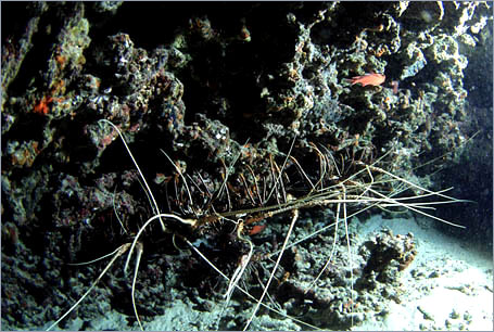 Small shoals of Long-jawed Squirrelfish (Sargocentron spiniferum) and Red Soldierfish (Myripristis murdjan) hover in crevices during the day and disperse to feed at night.