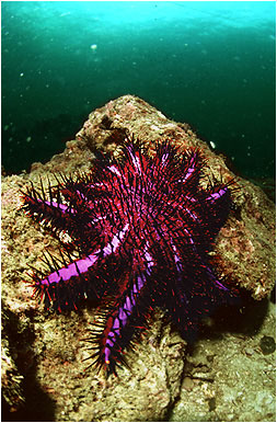 Common to this region, are purple Crown of Thorns Starfish (Acanthaster planci) which feed on the living polyps of Acropora coral. Back | Next