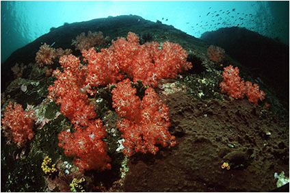 Rare but compact patches of red soft tree corals (Dendronephthya hemprichi) are a feature on some of the huge boulders found north of this island. Back | Next