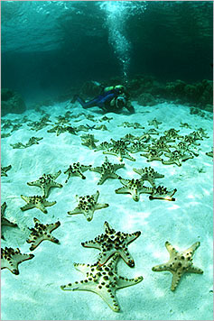 Horned Sea Stars (Protoreaster nodosus) gathering to spawn, a common occurrence in this region.