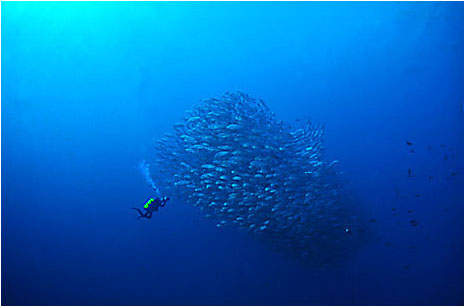 Impressive gatherings of Bigeye Trevally swim in tight formation for protection. Constant encounters with divers has made them very tame. Back | Next