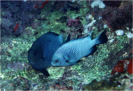 Three-spot Damselfish (Dascyllus Trimaculatus) spawning, the male remains in close attendance, trembling violently to encourage the female to lay her eggs. Back | Next