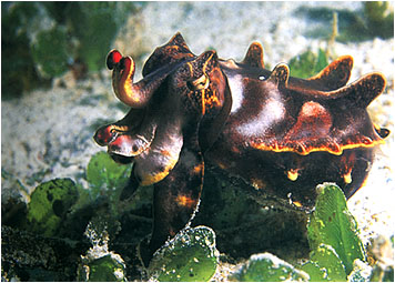 The remarkably bright colours of the 50mm Ornate Cuttlefish are mesmerising. Also known as Orchid Cuttlefish, many are found foraging for food in shallow waters among the sea grasses of Pulau Mabul. Back | Next
