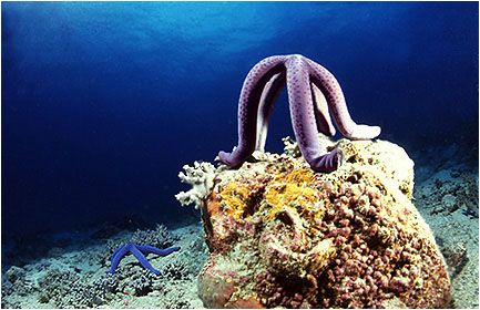 The majority of starfish adapt this arched stance during spawning. By doing so en masse into the current, they increase their chances of successful cross-fertilisation. Back | Next