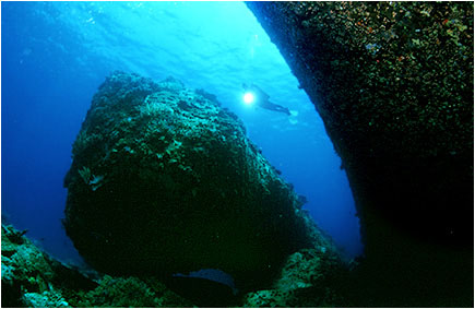 Classic underwater scenery off Pulau Tioman, enormous granite boulders on sandy sea floor. These boulders form swim-throughs and small caves and support a wide variety of colourful coral growth. Back | Next