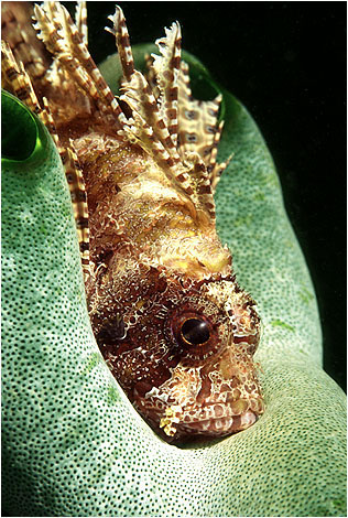 This beautiful but dangerous Dwarf Lionfish (Dendrochirus brachypterus) has found a perfect bed for the night on a Sea Squirt (Didemnum molle). Back | Next