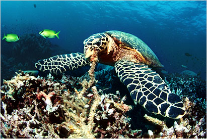 Divers are often blamed for damaging coral, but this Hawksbill Turtle (Eretmochylys imbricata) could be called to a 'vandal of the sea' for digging away 2 square metres of Staghorn Coral to feast on soft sponges growing beneath. Back | Next