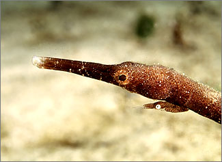 An unusual relationship, this tiny cuttlefish adapts its skin coloration and markings to match that of the docile Longsnout Pipefish (Trachyrhamphus longirostris) for camouflage. Back | Next