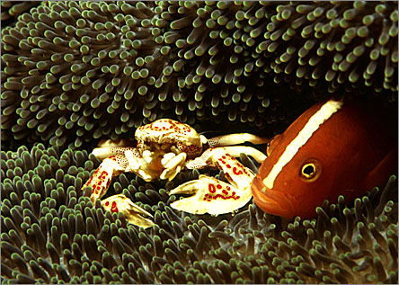 Spotted Porcelain Crab with a Clownfish on a Sea Anemone