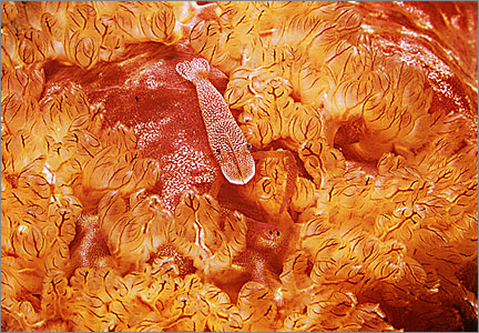 An Imperial Shrimp on the gill of a Spanish Dancer Nudibranch