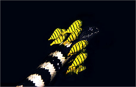 A Yellow Lipped Sea Krait accompanied by juvenile Golden Trevallies