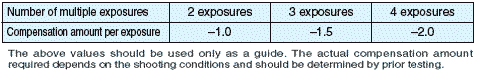 NOTE:- When the preset number of multiple exposures is completed, the film automatically advances to the next frame and multiple exposure mode is canceled. blinks in the LCD panel during multiple exposure photography. When taking multiple exposures on a single frame, you should decrease the exposure value for each exposure using exposure compensation