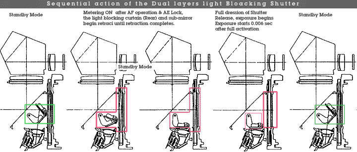 Sequential action of the double-shield Shutter Curtain and sub mirror movement before and during exposure.The shutter unit's dual-layer light blocking lever is driven directly from the front plate side by the M2 motor. Since a spring constantly applies light block-release force to the dual-layer light blocking lever, the shutter unit itself is designed as a dual-layer fight-blocking release-hold type unit.