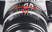 10-A. Choose an f-stop from the calculator dial. BEFORE you proceed, you MUST understand TTL flash exposure also has its limitation and certain guideline (Especially with the effective flash working distance) must be followed in order to achieve a higher degree of rate-of-success . Depending on how far away your subject is from the camera, you must select an appropriate working aperture by referring to the calculator dial. You'll notice that each f/stop (from f/2.0 to f/22) has its own color-coded line above the white distance scale indicating the range of distances at which you can shoot. For example, if you're using ASA/ISO 100 film and want to shoot subjects up to 6 meters (20 ft.) away, you can select f/4.0, f/2.8, or f/2. At f/4.0, the automatic shooting range is indicated by an orange line; it indicates you can shoot any subject between 1 and 6.2 meters (approx. 3 and 20 feet) away.
