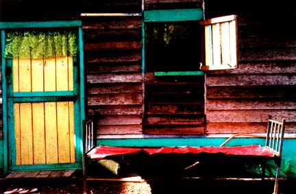 This is not an inside view or a bedroom scene. Instead, it is an exterior shot of a bed, door and window. It is very unusual to find a bed outside of a house. The peacock blue frame around the door, window and the lower portion of the house helps to unify the three separate entities.