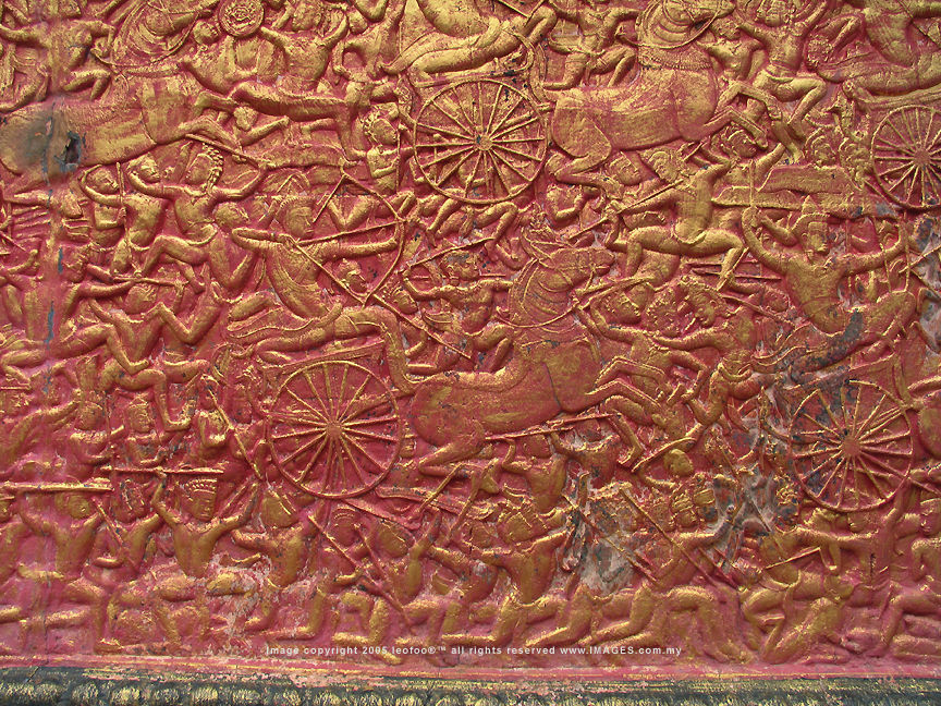 The stairway leads to Wat Phnom on top of the hill is flanked by 5 pairs of Naga (snake/dragon) and Chinthe (Singa or lion) - a popular image form often used on balustrades of temple causeways and platforms. A wall and another figure depicts ancient story lines of war and battles (click for enlarged detailed view(s)).