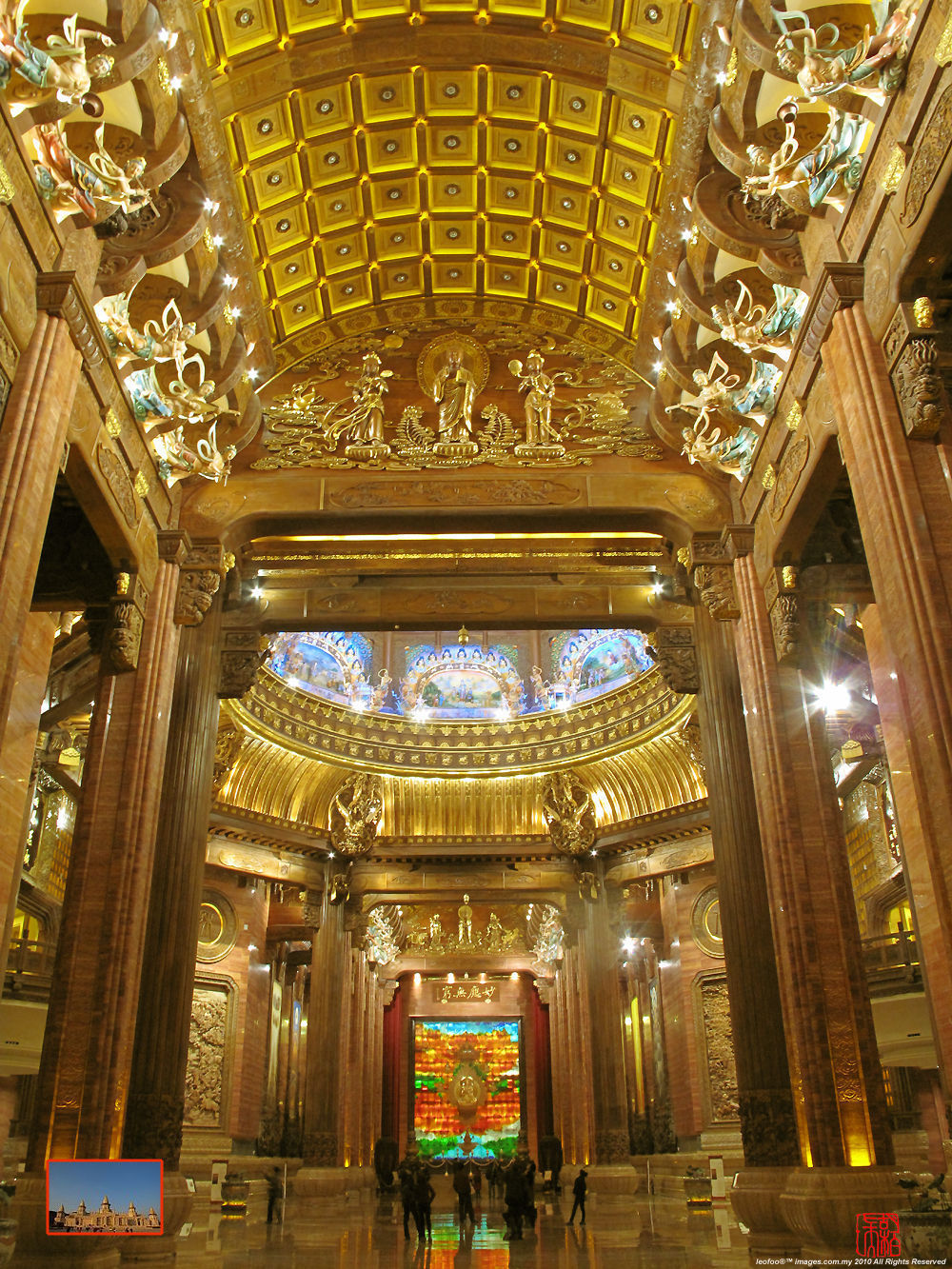 Other than the magnificient Grand Buddha Statue that emphasize scale and form, personally, I woudl think the recently completed Brahma Palace can be easily regarded as a must-see attraction in this Ling Shan Buddhist Theme Park. The Palace employs a Kazo-tower style architetural design where it combines some architectural elements of Buddhist grotto art form commonly found in China as well as it exhibits the traditional Buddhist-style. The interior has quality marvble-flooring all across, sections divided into multiples of art corridors, meeting rooms etc. which are bilateral symmetrical in its overall layout. It is spacious, clean and has a very strong ambiance of religious kind of quietness. This palace is large enough and high end facilities are so well equipped, easily be able to accomodate international class, functions, meetings, or even convention and other Buddhist thematic exhibitions. Each visitor must take off their shoes before entering, while a protective cloth is suppiled in order to protect the mirror-like marble flooring. The three main highlights in the Brahma Palace is the Aisle Hall, Tower Hall as well as the Altar Hall.
