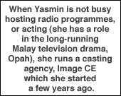 or acting (she has a role in the long-running Malay television drama, Opah), she