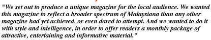 A quick glance through the magazine will reveal over a hundred pages of various departments and stories, offering a wide fare of subjects from art, music, politics, social issue, fashion to so much more. This is reflective of the variety of issues that interest the discerning Malaysian reader of today. Our cover personalities come from all walks of life-politicians, entertainers, corporate figures, athletes, television personalities and other prominent faces in society. There is something for everyone, be it witty, humorous, serious, entertaining and informative. Click here if you're interested to find out how you can get the magazine.