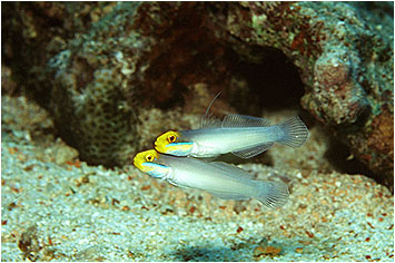Normally in pairs, these nervous Blue-Streak Gobies (Valenciennea strigata) scoop and sieve sand for nutrients. When alarmed they will bolt and hide in their dens among rubble. Back | Next