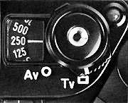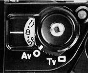Aperture Priority AE 1) Make sure the aperture ring of the lens is set to the "A" (Auto) mark. 2) Switch the AE mode selector to Av setting. 3) Select an aperture by turning the AT dial.Note: when the mode selector is set to either Av or Tv, the value on the scale will change to either shutter speed settings or aperture value. The aperture scale is color-coded for easy reference so as not to mix up with the shutter speed scale.
