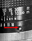 When the A-1 is directly coupled with an FD lens, aperture control is totally automatic. Exposure metering is performed at full aperture whether the lens aperture ring is at the "A" mark or set to a specific aperture. At shutter release, the diaphragm automatically closes down to the aperture set by the camera or by you with the AT dial or the aperture ring.