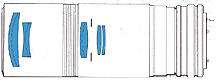 The optical system uses high refraction index glass and cemented lenses which is for countering coma, especially that arising from the part of the optical system responsible for varying magnification.