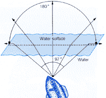 Looking through the viewfinder of a camera equipped with a 7.5mm fisheye lens can be an experience. You see everything from the ground at your feet (and perhaps your feet, too), to the sky overhead and virtually everything to your right and left within a radius of 180°. The image in the viewfinder is circular in the middle of the picture frame and that's the way it will be reproduced on film. The fisheye lens' view is like that of a fish looking through the water to the surface as shown in the illustration below. Because of the refraction between water and air the fish has a tremendously wide angle of view. The front element of a fisheye lens has an extreme amount of curvature which accounts for its 180° vision.