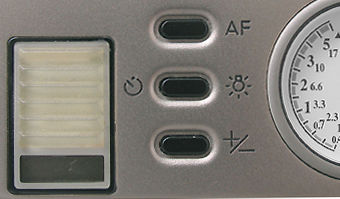 The shutter release button cum Exposure Mode Selector on the top panel is a feather touch electromagnetic button. When lightly press, it will activates the metering and stay on for a period of time, turn off to conserve battery power. For exposure control, just slide the mode selector lever to the orange "P" will activate Programmed AE where it will set optimum exposure automatically. You can opt for alternate Aperture-Priority AE (green "A"), which lets you select the apertures from f/2.8 to f/22, while the camera sets the matching quartz timed shutter speed to deliver an exposure. Or you can also use Flexible Program to set a different combination of aperture and shutter speeds while keeping a correct exposure. The L.T on the selector dial stands for LONG TIME exposure, it doubles up as a B setting on SLR camera, except it operates slightly different. When you push the lever to "L.T", shutter remains open until the shutter release button is depressed for the second time. The time duration can even last up to 10 minutes. The film counter cum exposure time calculator (great huh ?) on the top analogue display will begin rotating from "o" position, and indicating the exposure time (it will stop at the L.T mark after 50 seconds to conserve power). Remember to depress the shutter release button once more to stop exposure after you have determined the duration is enough.