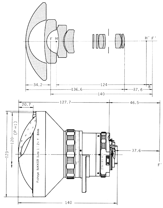 The front lens element has a dome liked design. As the meter-coupling prong is provided with this lens, Exposure determination is possible with the diaphragm fully open, as in the case of other Nikkor Auto lenses. The 8mm f/2.8 Fisheye-Nikkor Auto covers 180° angle of view adopting the equidistant projection formula like the Fisheye Nikkor 6mm f/5.6, Fisheye-Nikkor 7.5mm f/5.6 and Fisheye-Nikkor 8mm f/5.6 lenses.