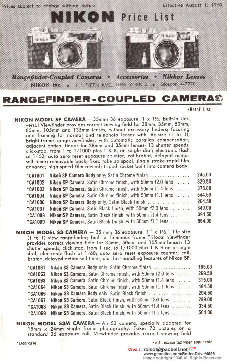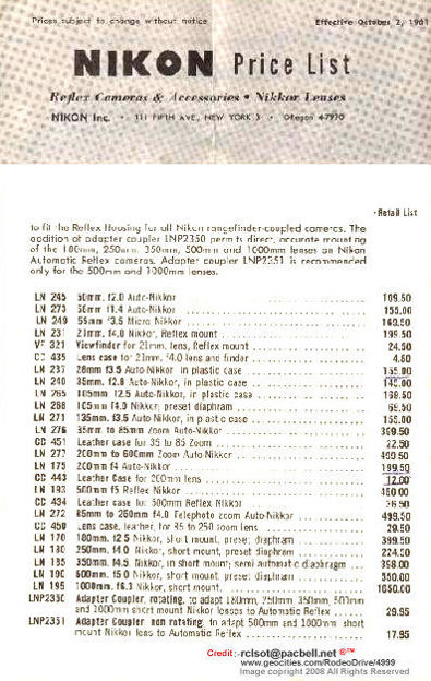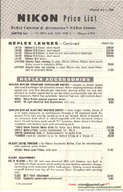 Nikon original Price Lists:- 1958 (bottom); 1959 (right);