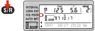 , pressing SET/RESET button does not set Long Time Exposure function, but causes shutter speed indicators to blink, * Data to be imprinted can be changed or set after setting the Long Time Exposure function. While pressing FUNCTION button, rotate camera's Main-Command Dial to select In Frame or Between-Frames Data Imprint function, then change and/or set data as desired. Function set indicator (I will remain next to the Long Time Exposure symbol.