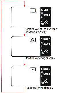 While pressing the metering mode selector, turn the electronic input dial until the desired metering mode appears on the display panel. (The display moves cyclically.)