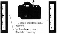 1) Press the spot metering button to indicate the fixed dot at the position of the triangle index. 2) When the highlight control button at the upper back of the camera is pressed and released, the dot starts moving upward to make compensation. Set the desired amount of compensation according to how bright the subject is.