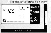 ï When the spot metering button is pressed, both the shutter speed and the aperture are displayed at the bottom of the viewfinder. The fixed dot (<) will then appear at the position of the triangle index on the right of the viewfinder.ï When the spot metering button is pressed, the exposure value is kept locked in the camera's memory for 30 sees after you have removed your finger.