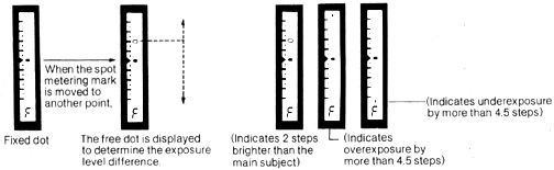 When you move the spot metering mark to another point of the subject after the spot metering button has been pressed, the new metering value (<) will appear to the right of the viewfinder as a free dot. You can check the exposure level difference between the main subject (stored into memory by the fixed dot) and another point of the viewfinder, that exists in the scene before pressing the shutter button.