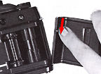 The camera back of your CONTAX RTS can be interchanged with the Data Back or 250 Film Back available as optional accessory. Remove the camera back as illustrated while pushing down the back cover release lug.