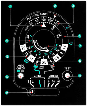 (7) Auto Flash Range Guide In the TTL Auto and Normal Auto modes, the Auto Flash Range Guide shows the effective flash range for the coverage aperture, Align the white band's extreme right (Thick white band) with the coverage aperture reading on the Exposure Computer Dial. The white band indicates the effective flash range for the given aperture.