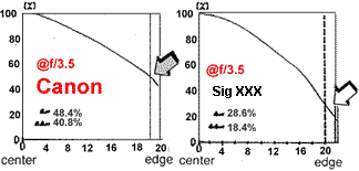 Image Illumination: - (Level of Peripheral Light) These charts show performance level from the center to the edge. The left end is the center of the lens when performance level is 100. The little performance level declines, the better the lens is.