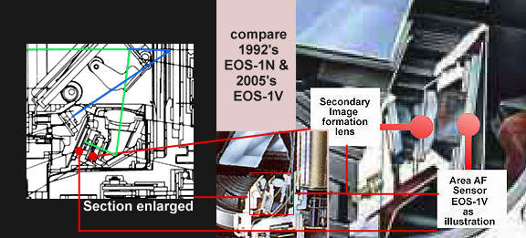 (2) Focusing Principle The focusing principle is the same type of TTL-SIR (stands for Through The Lens Secondary Imaged Registration) system used in previous EOS SLRs. However, the EOS-1N's system combines the high-precision AF design of the previous Canon EOS-1 (with the C-V-BASIS central vertical line sensor providing three times the image shift sensitivity of the other sensors) with the multi-AF design (wide-zone focusing/five focusing points) of the eye-controlled Canon EOS 5, realizing high-precision multi-AF.
