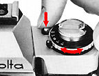 Around the ASA/DIN conversion scale is a convenient frame that can be used to keep memos handy with the camera. It is just the right size to hold the film-box end, which can be inserted as a reminder of the film in use.| Previous | Next | Exposure control and Metering