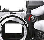Remove the lens and F2S/F2SB Photomic finder from the camera and pull up the camera rewind knob as far as it will go.