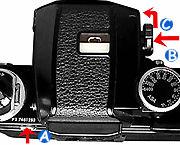 To remove the F2 Photomic Finder, depress center of the finder release lever (B)and turn it downward (C), then press the finder-release button (A) on the back of the camera. The finder snaps loose and can be lifted out .