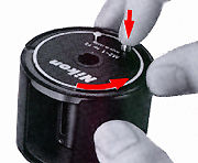 To open the cassette, hold it with the "Nikon" name facing up and the cutout of the outer shell facing you. While depressing the release pin on top, turn the inner shell. When the outer shell's cut-out coincides with that of the inner shell, the inner shell slips free, enabling the removal of the spool.