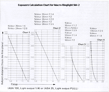 The ringlights use either an AC power supply, LA-1, which can be switched to operate from 100VAC, 117VAC, 220VAC or 240VAC, or even with a battery pack (LD-1). These power supplies can also be shared and used with the Medical Nikkor lens.Note: In extreme close up range, normal Guide Numbers are not applicable. You may use an accompanying chart to calculate proper exposures (Vertical scale is distance in "mm", horizontal values are in f-stop).