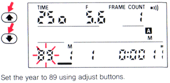 For practice, adjust date (Between Frames) and time (in Frame) to read January 26, 1989, 15:30~00. 1. Push FNC button to select Between-Frames Data Imprint function, then confirm function indicator appears.2. Confirm display shows Year/Month/Day.