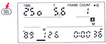 4. Set number of shots per shooting and number of shootings. Push MOD button. The left numerical indicator indicates frames per shooting- the right numerical indicator shows the number of shootings. Push the SEL button so the left indication starts blinking, then push adjust buttons until desired number appears.