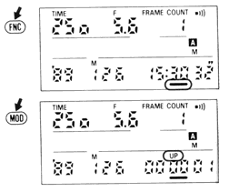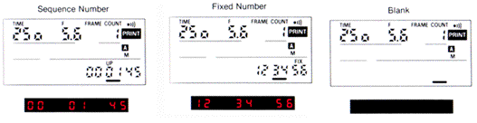 Set Sequence Number FNC button to select the In-Frame Data Imprint section. Push MOD button several times until the ) shows Sequence Number (UP). With this display showing, you can imprint any desired number and it automatically increase by one each time you depress the shutter.