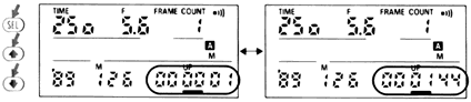 Push SEL button once to access the two left-hand numerals, twice to access the two middle numerals and three times to access the right-hand numerals. To change the numerals, push adjust buttons until desired number appears. For a blank display, set to - - (located between 99 and 00). To complete setting, push SEL button again. If you change batteries for multi-control section during shooting, the Fixed Number display will be reset to 000001.
